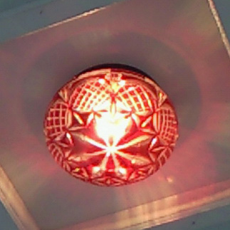 透明なクリスタルガラスの上に色ガラスを厚く被せて角度の浅いカットを施すと、